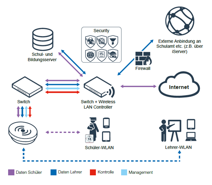 Das Fundament dafür bilden anspruchsvolle kabelgebundene und drahtlose Netzwerkinfrastrukturen, die gleichermaßen leistungsstark, zuverlässig und hochverfügbar sind – und dabei höchsten Sicherheitsansprüchen genügen. Neben einem Jugendschutzfilter für die Lernenden gehört dazu auch die Sicherstellung des DSGVO-konformen Umgangs mit personenbezogenen Daten.